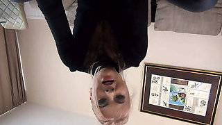 Blinded slave Raven Bay gives a deepthroat to her lucky fellow