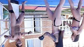 2 Mistresses Ballbusting a Muscular Bodybuilder Victim (Femdom) Tied up