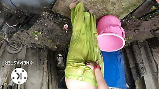 Stepdad providing some discipline ass spanking with slipper to his ultra-kinky girl for wasting water