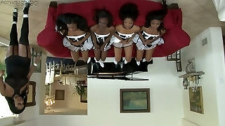 Dominant black milf plays with a pile of ebony housemaids on the couch