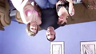 Nerdy pervert gets successful and fucks two lingerie babes in bed