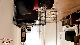 Mistress rides cable-on dildo on locked chastity slave