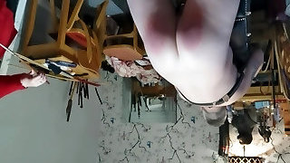 Super-fucking-hot housewife Lukerya in a dog collar, white nylon stockings and handcuffs