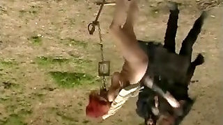 Tied up big breasted curly auburn harlot gives ebony and white pals BJs
