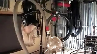 While being fucked with bang-out machine wild brunette gives BJs to masters