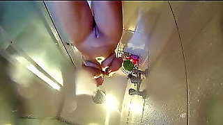 Voyeur camera in the douche. Young nude girl rubs her body with massage oil