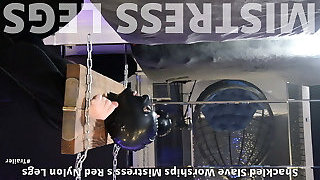 Shackled Slave Worships Mistress's Red Nylon Legs