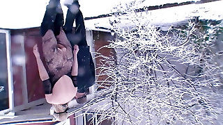 Two German slaves pleasing their big hard-on master outdoors
